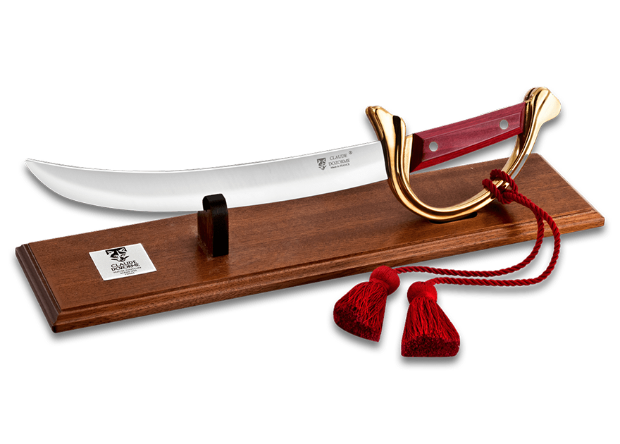 Avec ce sabre qui aurait pu s’appeler Corsaire ou bien Pirate, la Maison Claude DOZORME propose un modèle avec une très belle garde qui enveloppe largement la main et permet de le présenter sur un socle façon chêne, car un sabre c’est aussi un objet de décoration. Lame acier brillante ou bien lame noire mat, manche palissandre, chêne ou encore méthacrylate noir, vous aurez le choix !