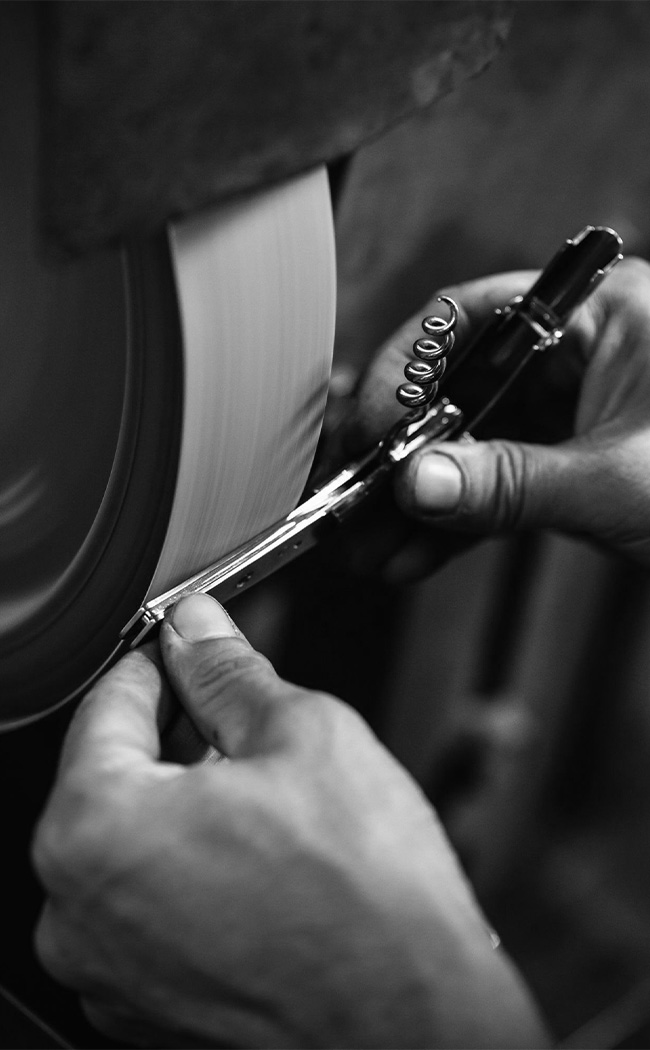 Dernière étape majeure de son parcours, l’affilage : moment crucial pour que le couteau soit parfaitement tranchant. Poli, lustré et affilé, il lui reste à recevoir sa signature, gravée au laser : un marquage précis, indélébile et personnalisable.