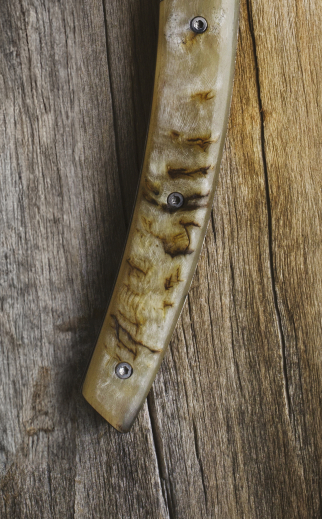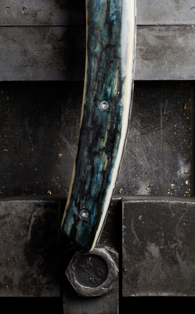 Tout comme la lame du couteau qui se doit d’être parfaite, le manche est une pièce à part entière, mûrement réfléchie qui donne une véritable noblesse et de la plus-value à l’objet. Qu’ils soient habillés de matières naturelles (bois, corne, nacre, galuchat, cuir, ivoires ou molaires de mammouth), d’incrustations (cristaux, plumes véritables ou mouches de pêche) ou encore de matières synthétiques très haut de gamme (méthacrylate, Crystallium…) les manches des couteaux Claude DOZORME se parent de leurs plus beaux atours.