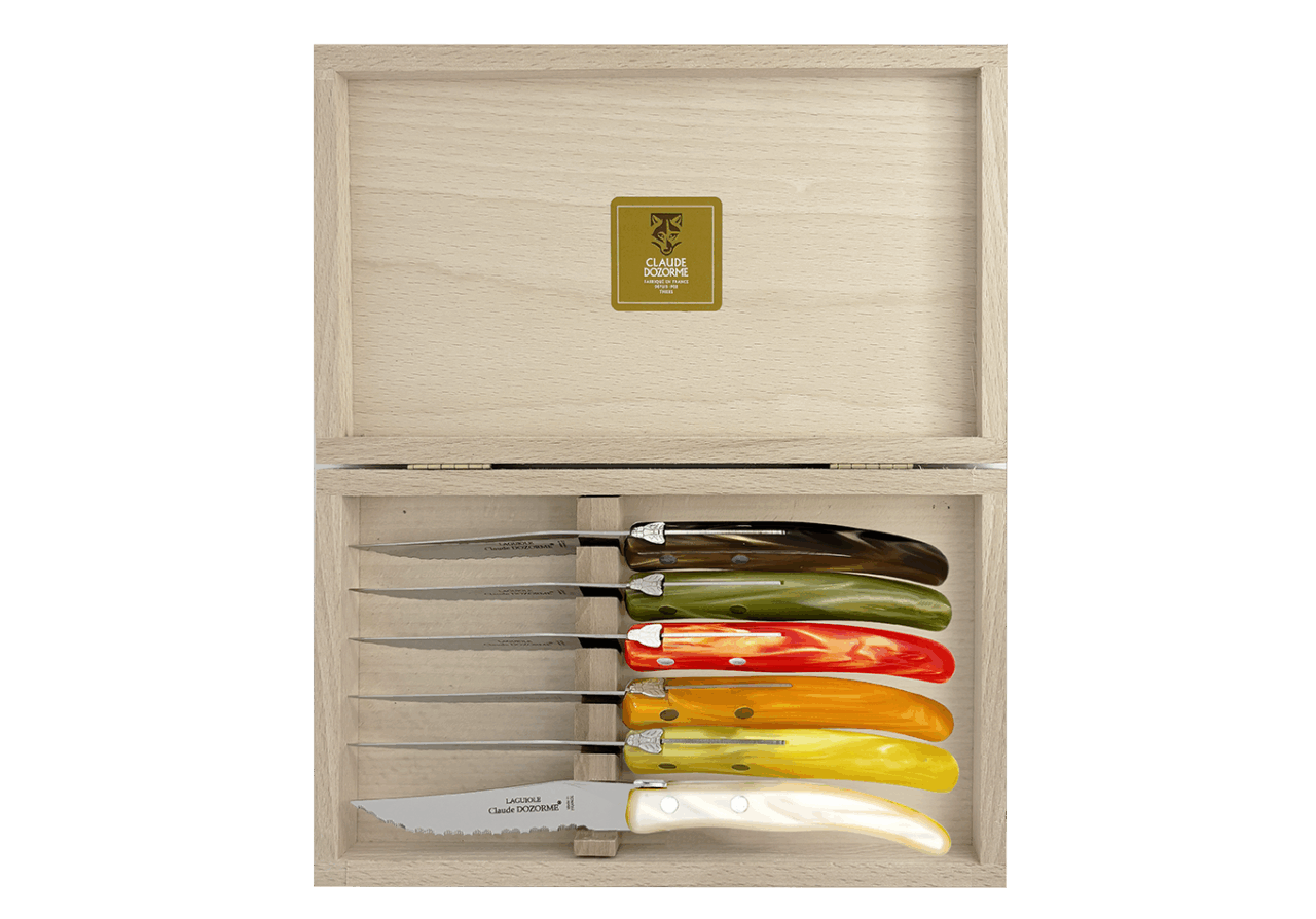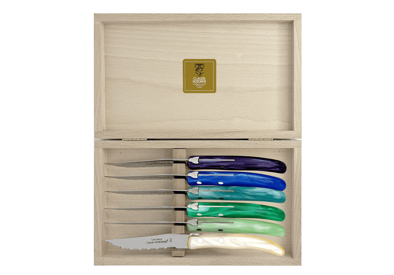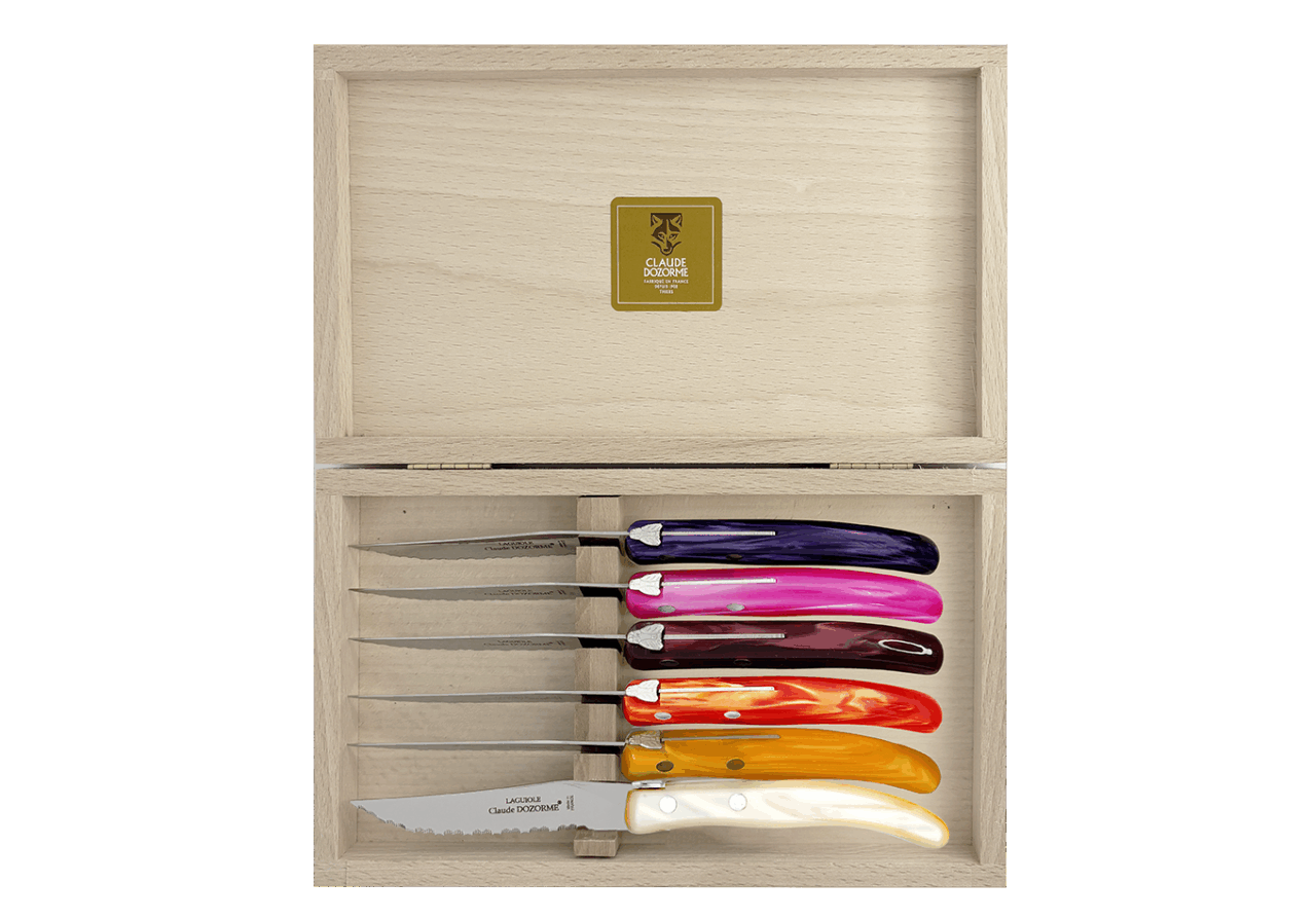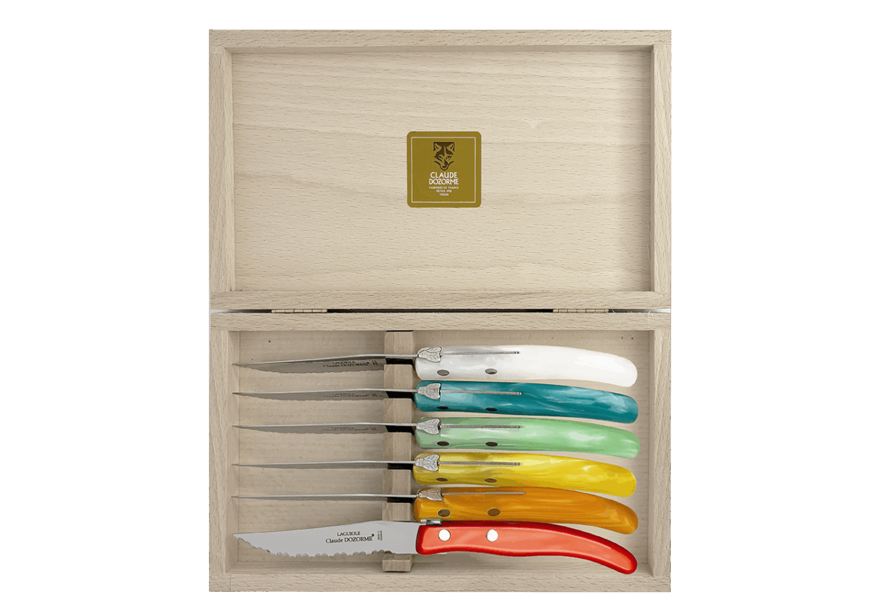 Dans une profusion de couleurs une dizaine de couteaux vous attendent pour préparer vos plats. Vous passez à table, quelle chance ! Les couverts et les services sont assortis ! Avec ce best-seller de la Maison Claude DOZORME, vous faites le choix de la gaieté, en cuisine comme à table, à un prix très doux et toujours avec la qualité « fabriqué en France ».