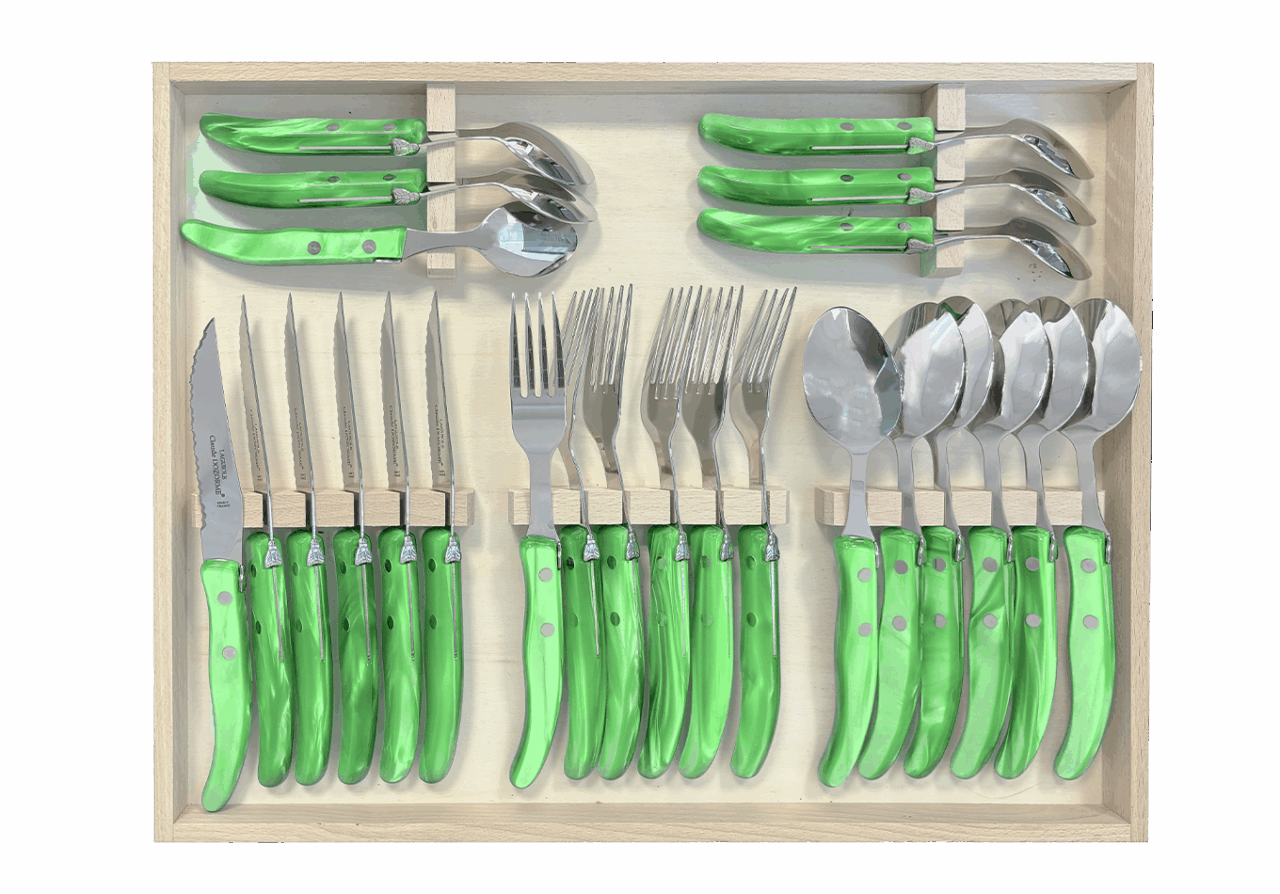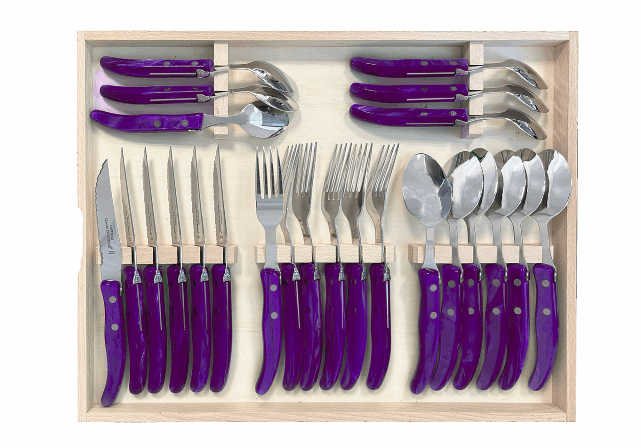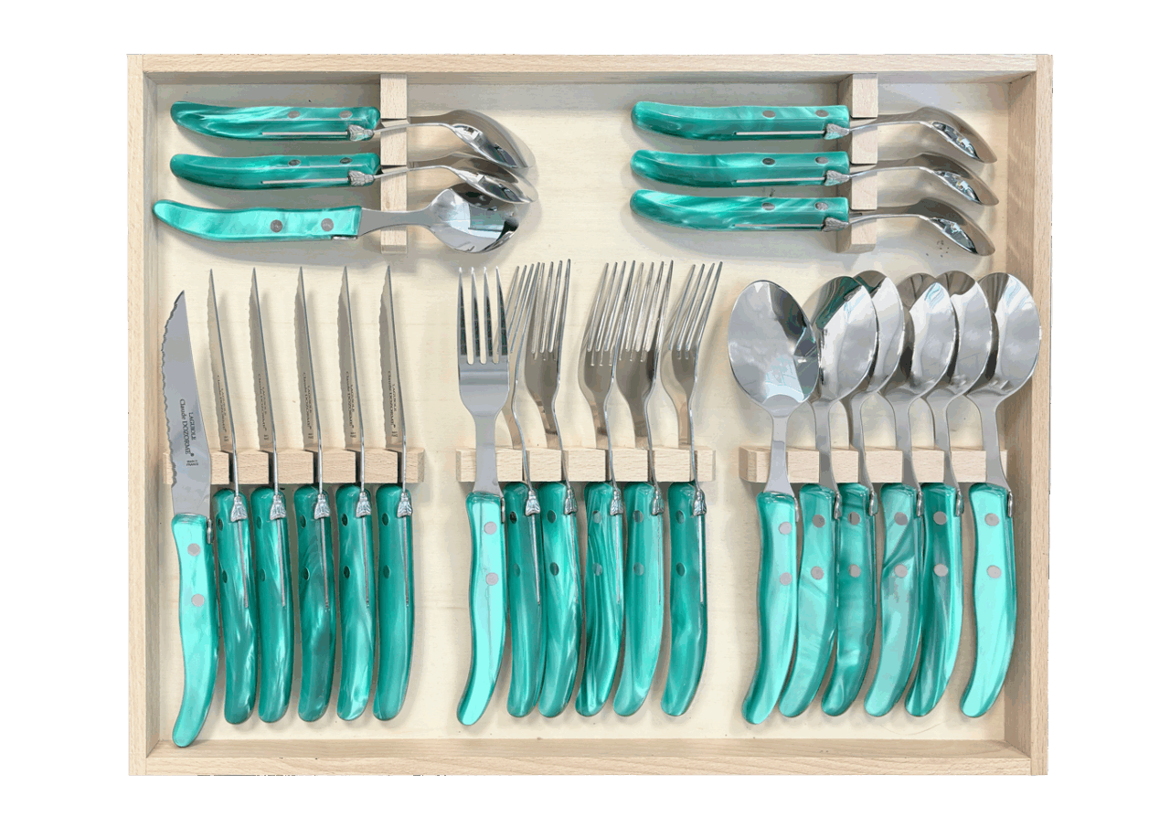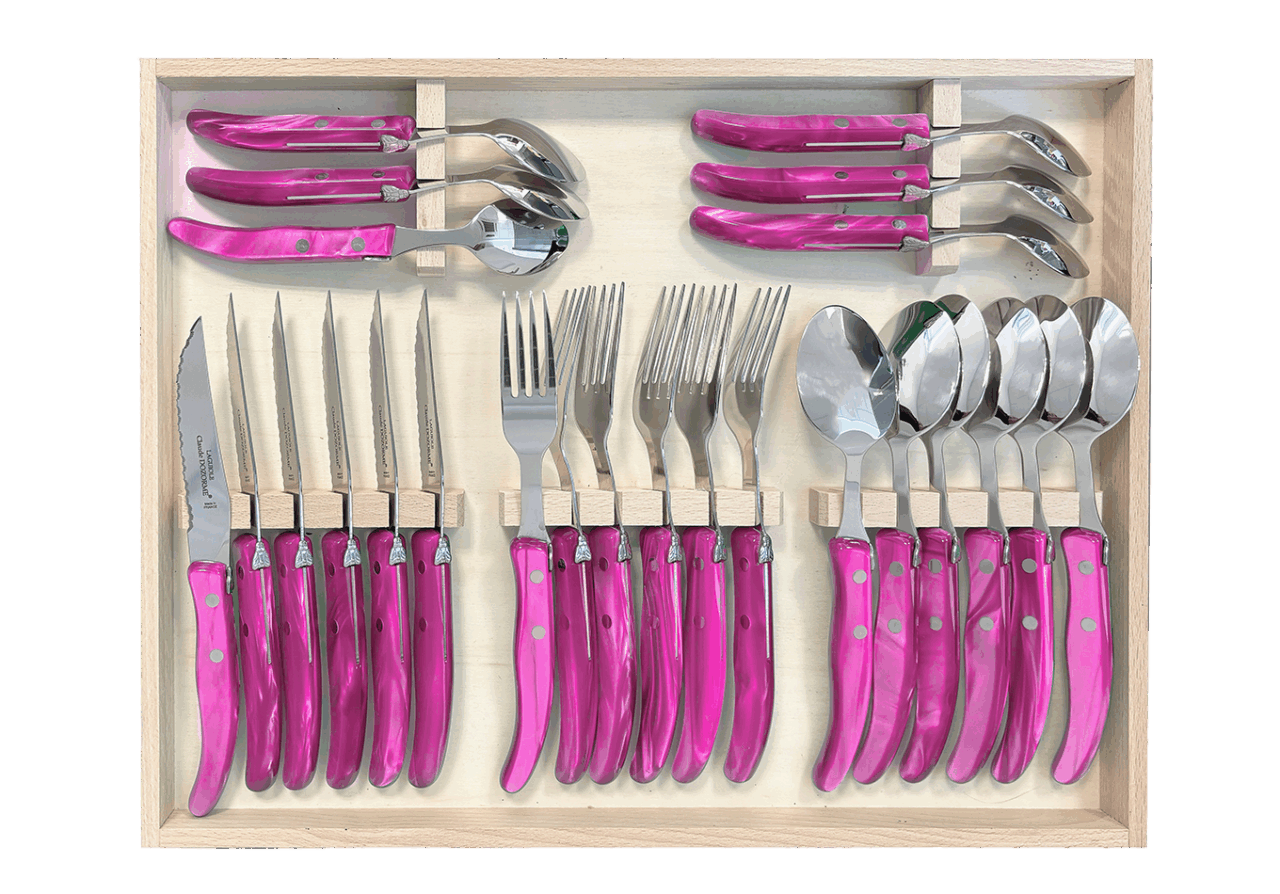 Cet ensemble de couverts Berlingot est conçu pour un usage quotidien et passe au lave-vaisselle. La microdenture de la lame des couteaux à steak est faite manuellement. Fine et précise, cette microdenture est extrêmement tranchante et ne déchire pas la viande. Accompagné de la fourchette, de la cuillère à soupe et de la cuillère à café Berlingot, aux designs et aux manches colorés, cet ensemble habillera vos tables pour chacun de vos repas. N’hésitez pas à mélanger les couleurs avec les Panachés Claude DOZORME. Notre gamme Berlingot apporte de la couleur dans votre cuisine et sur vos tables.