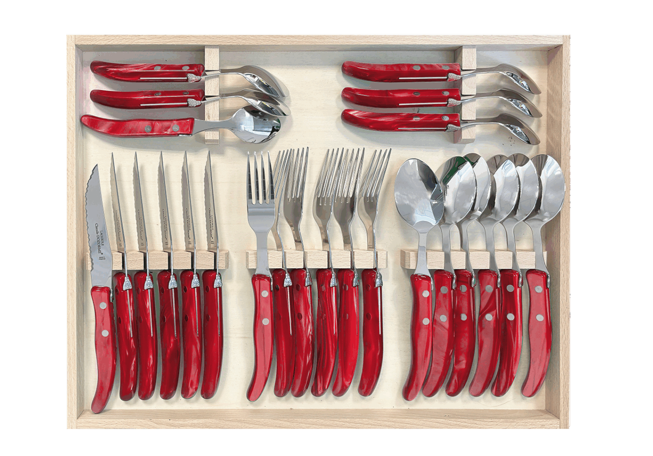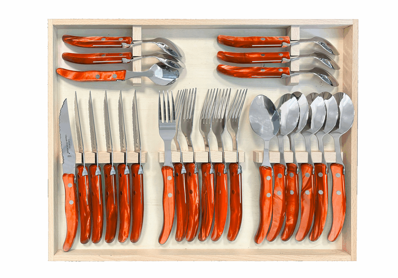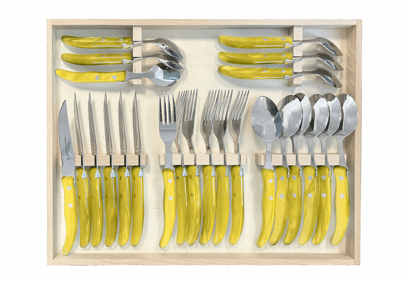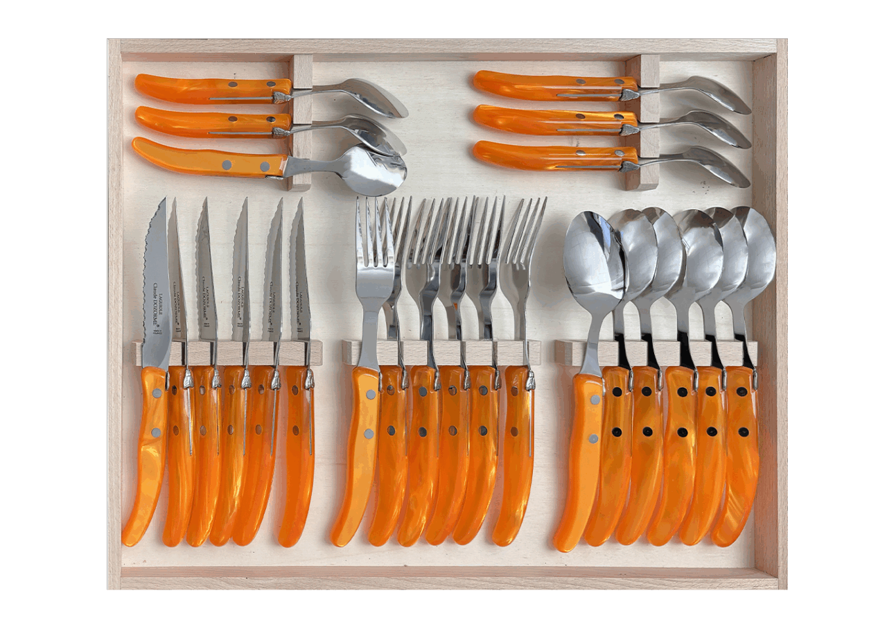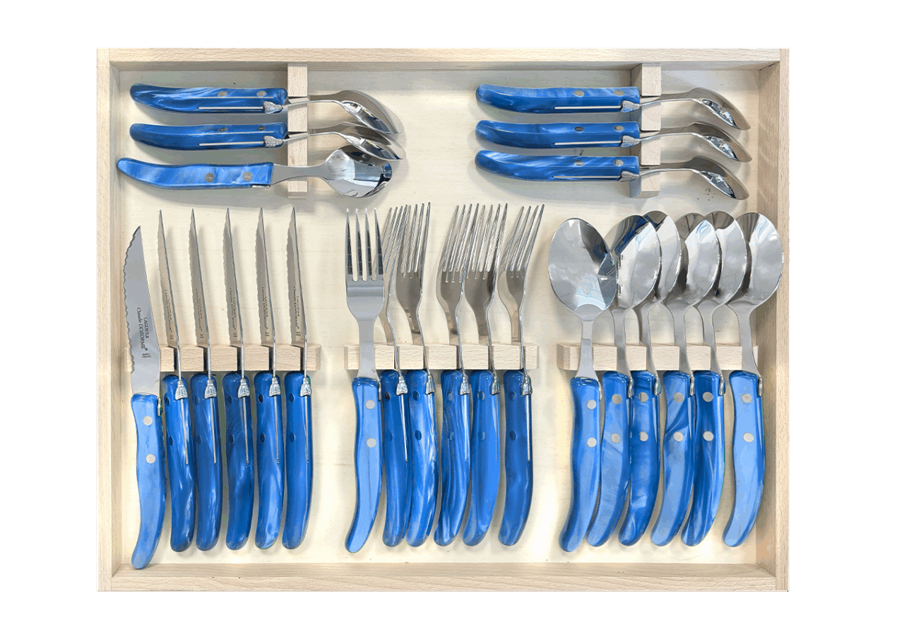 Cet ensemble de couverts Berlingot est conçu pour un usage quotidien et passe au lave-vaisselle. La microdenture de la lame des couteaux à steak est faite manuellement. Fine et précise, cette microdenture est extrêmement tranchante et ne déchire pas la viande. Accompagné de la fourchette, de la cuillère à soupe et de la cuillère à café Berlingot, aux designs et aux manches colorés, cet ensemble habillera vos tables pour chacun de vos repas. N’hésitez pas à mélanger les couleurs avec les Panachés Claude DOZORME. Notre gamme Berlingot apporte de la couleur dans votre cuisine et sur vos tables.
