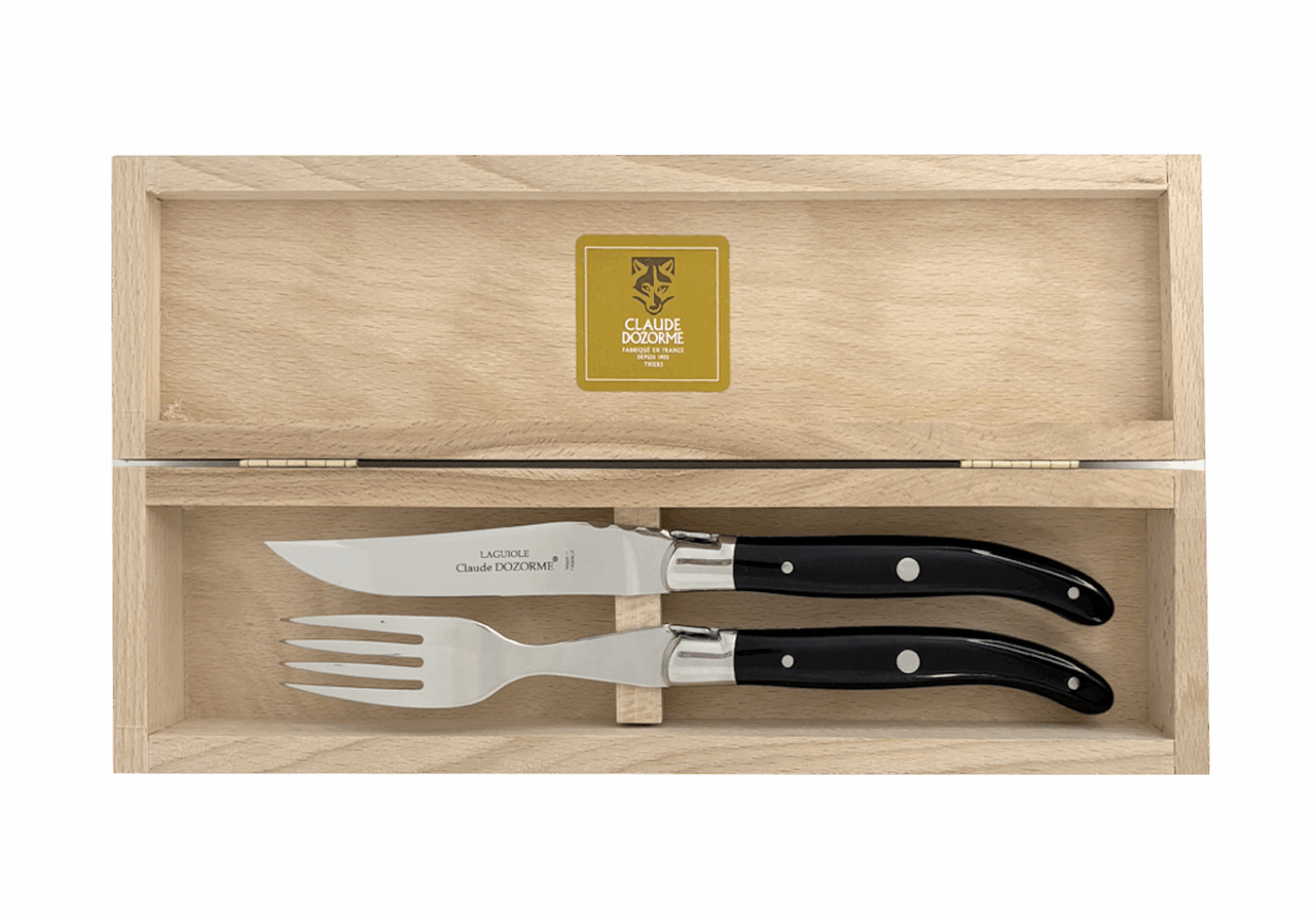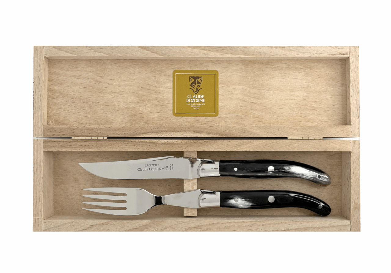 La lame plein manche – en acier spécial haut de gamme X50CrMoV15 (0,50% de carbone, 15% de chrome, 1% de molybdène et 1% de vanadium) garantit un excellent tranchant, une grande tenue de coupe et facilement réaffûtable. Fourchette acier 304L écroui.Fabrication 100 % française dans nos ateliers à Thiers.