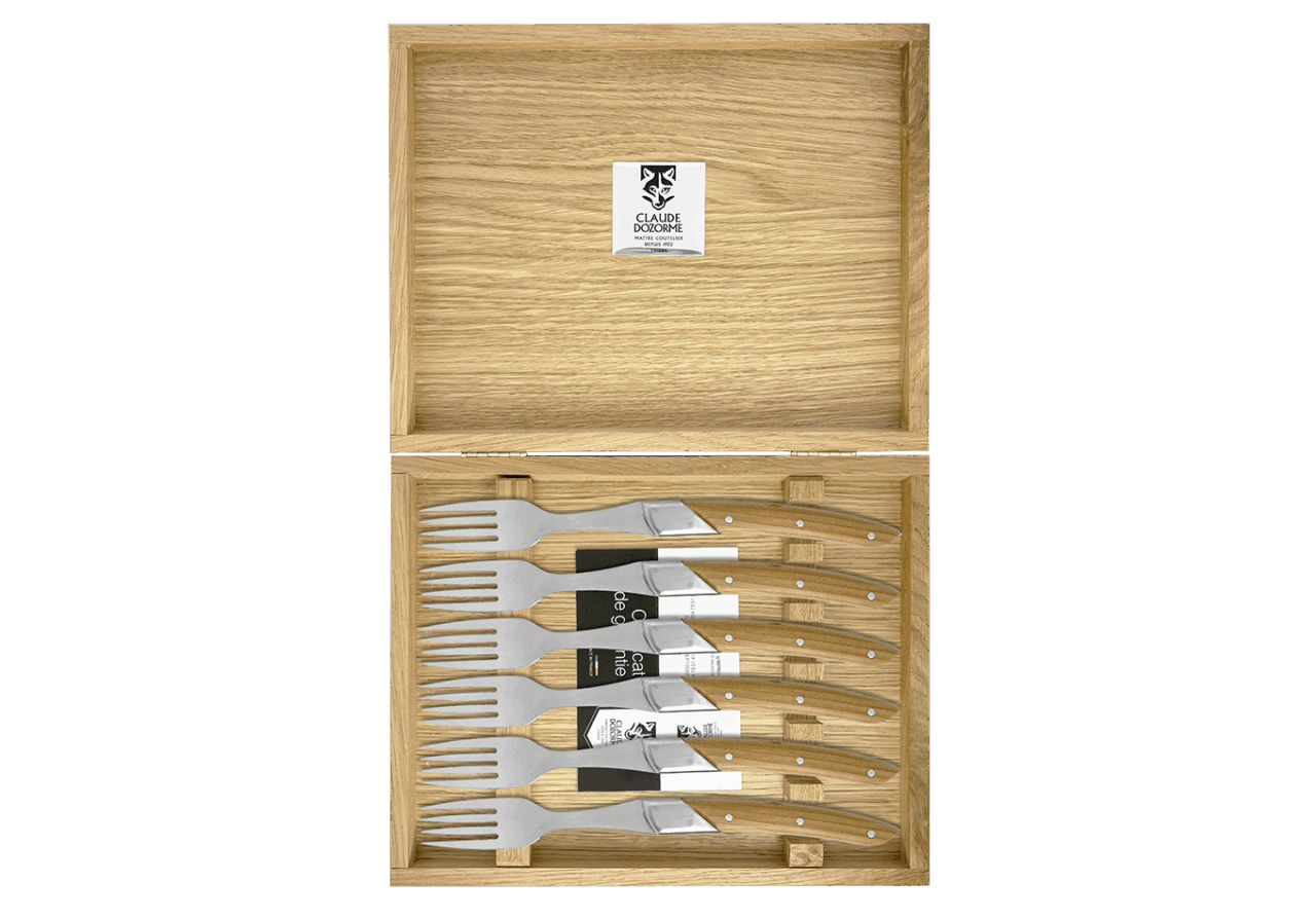 Son manche en bois d’ébène, bois de genévrier ou en ivoirine habillera vos tables au côté du couteau.
