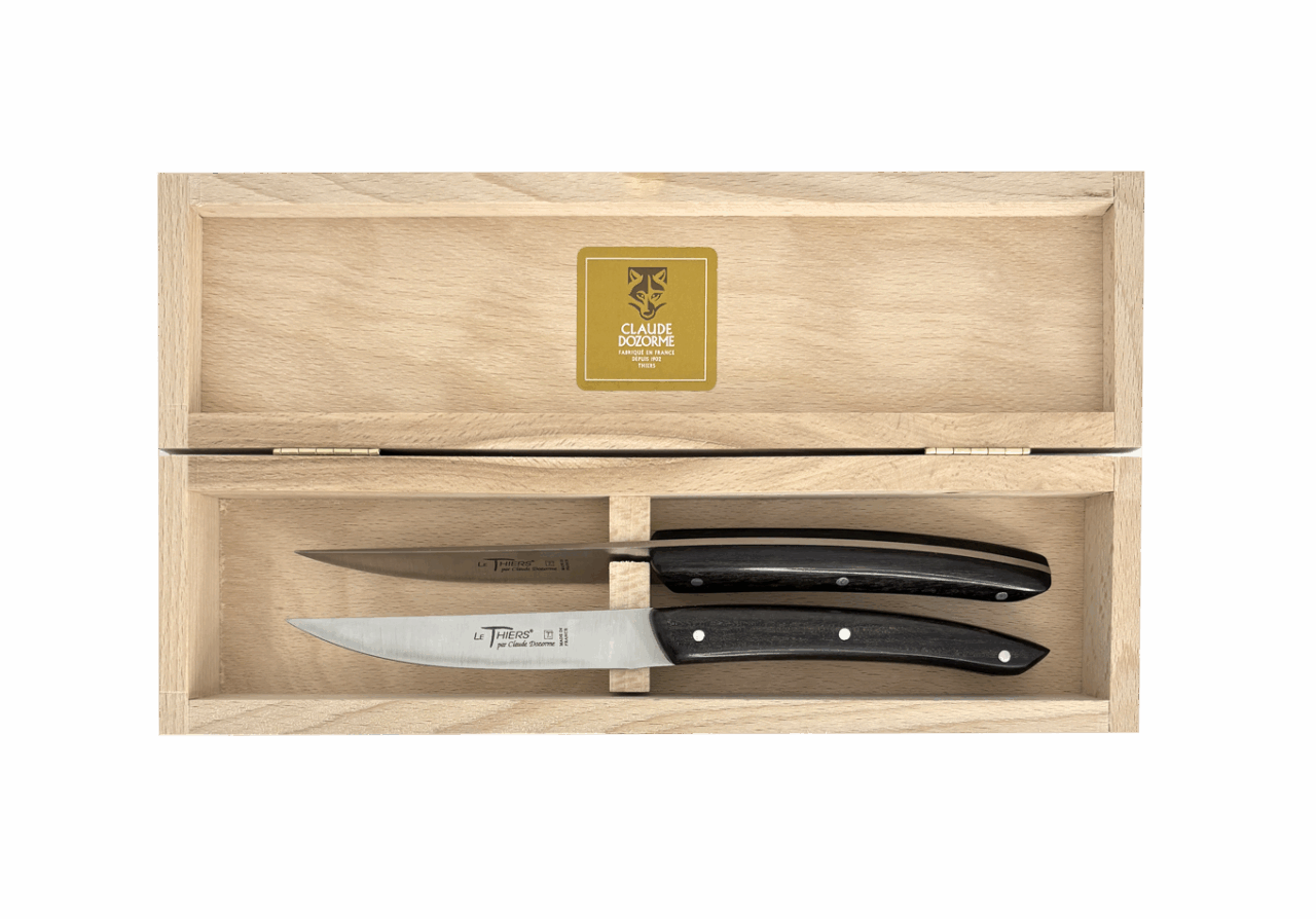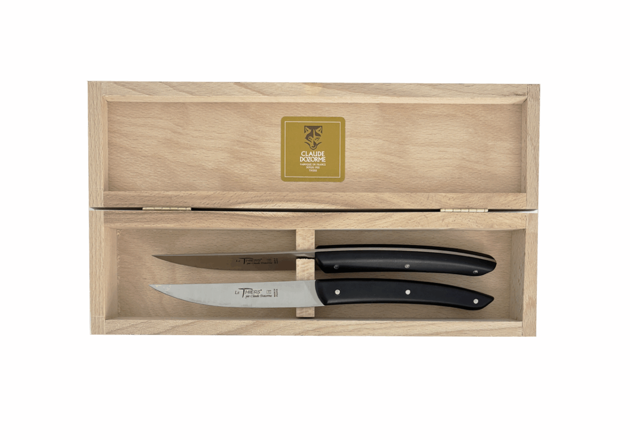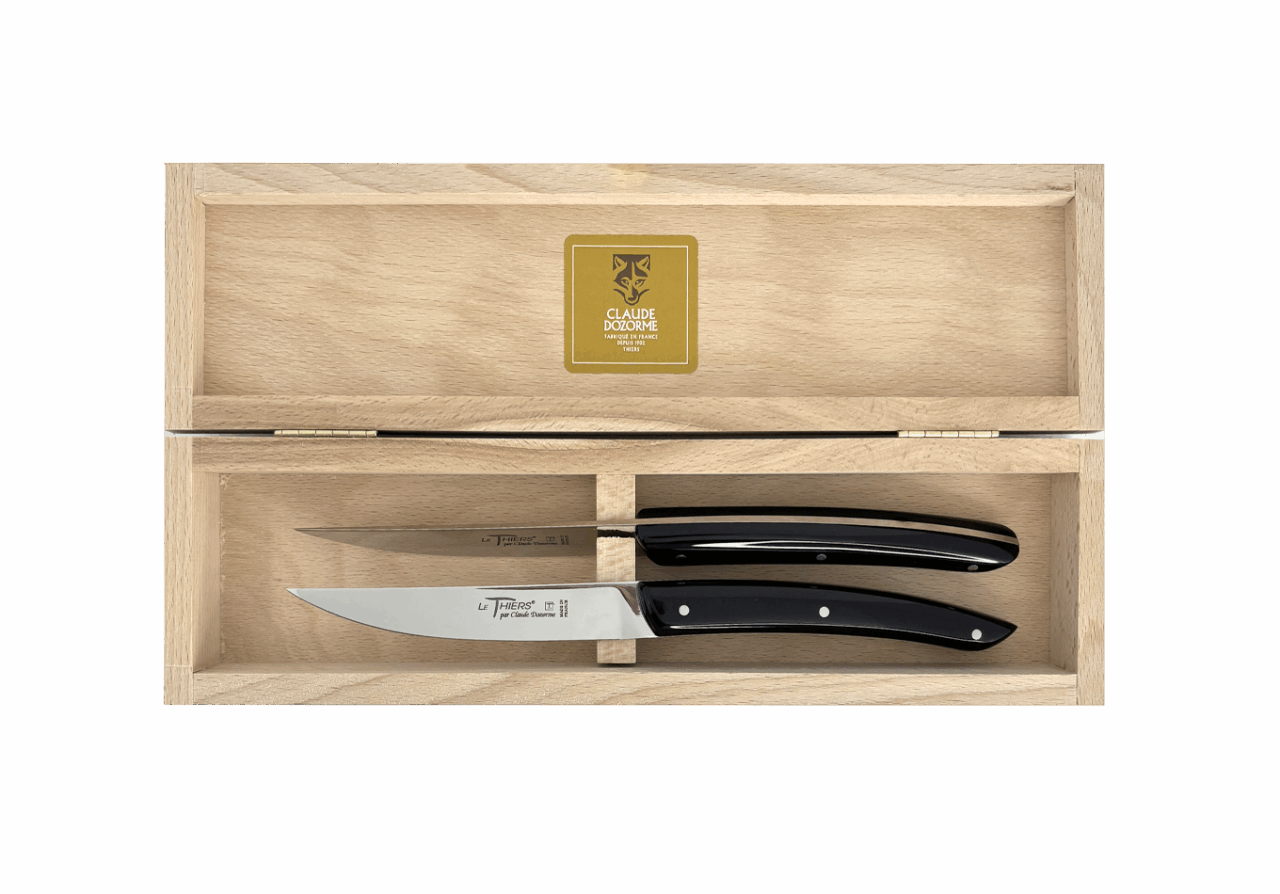 Forme emblématique de la coutellerie thiernoise, Le Thiers® est obligatoirement fabriqué localement. Claude DOZORME l'a décliné avec les codes de la Maison. Lignes fluides, détails épurés, matières nobles et qualité de fabrication, rendent ce couteau incontournable sur les tables contemporaines.