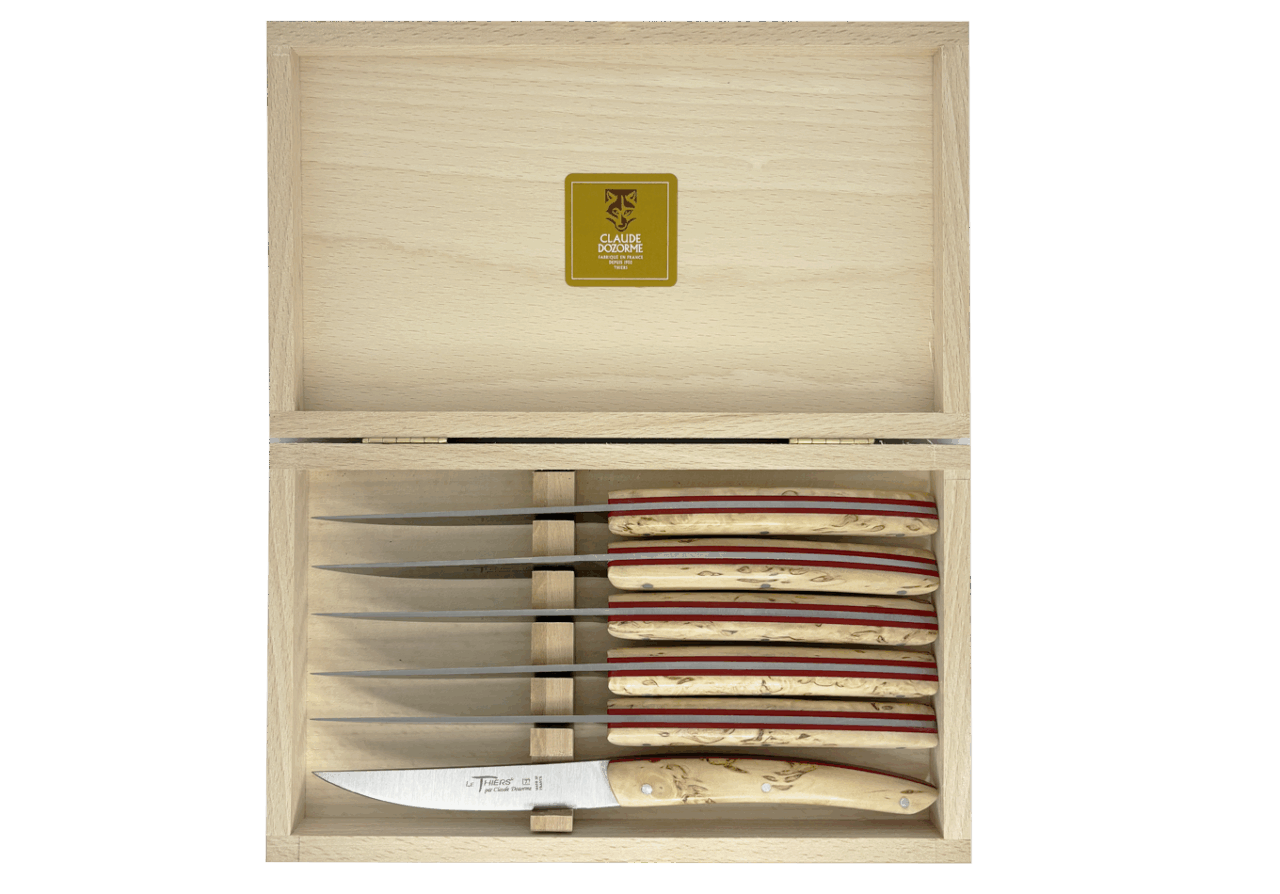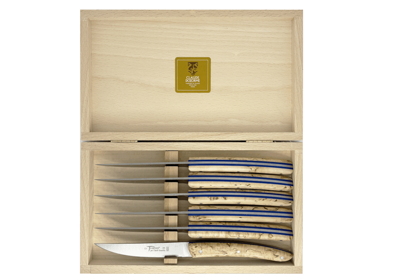 Forme emblématique de la coutellerie thiernoise, Le Thiers® est obligatoirement fabriqué localement. Claude DOZORME l'a décliné avec les codes de la Maison. Lignes fluides, détails épurés, matières nobles et qualité de fabrication rendent cette ménagère incontournable sur les tables contemporaines.