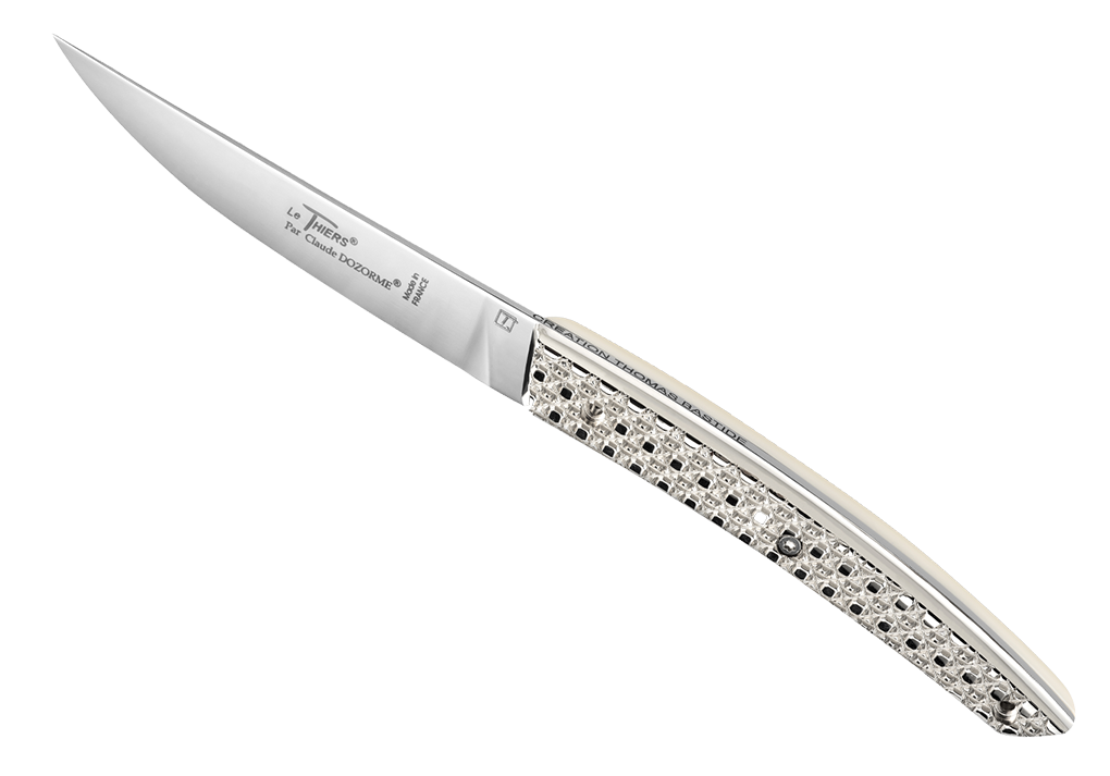 Le célèbre designer Thomas BASTIDE en a révélé l'âme et imaginé les motifs, le Maître Coutelier lui a donné naissance et fait ainsi entrer Le Thiers® dans le monde du luxe. Véritable pièce d'orfèvrerie, ce modèle signe de manière exceptionnelle les tables les plus luxueuses, sans compromis, avec la possibilité de le personnaliser, ultime raffinement.