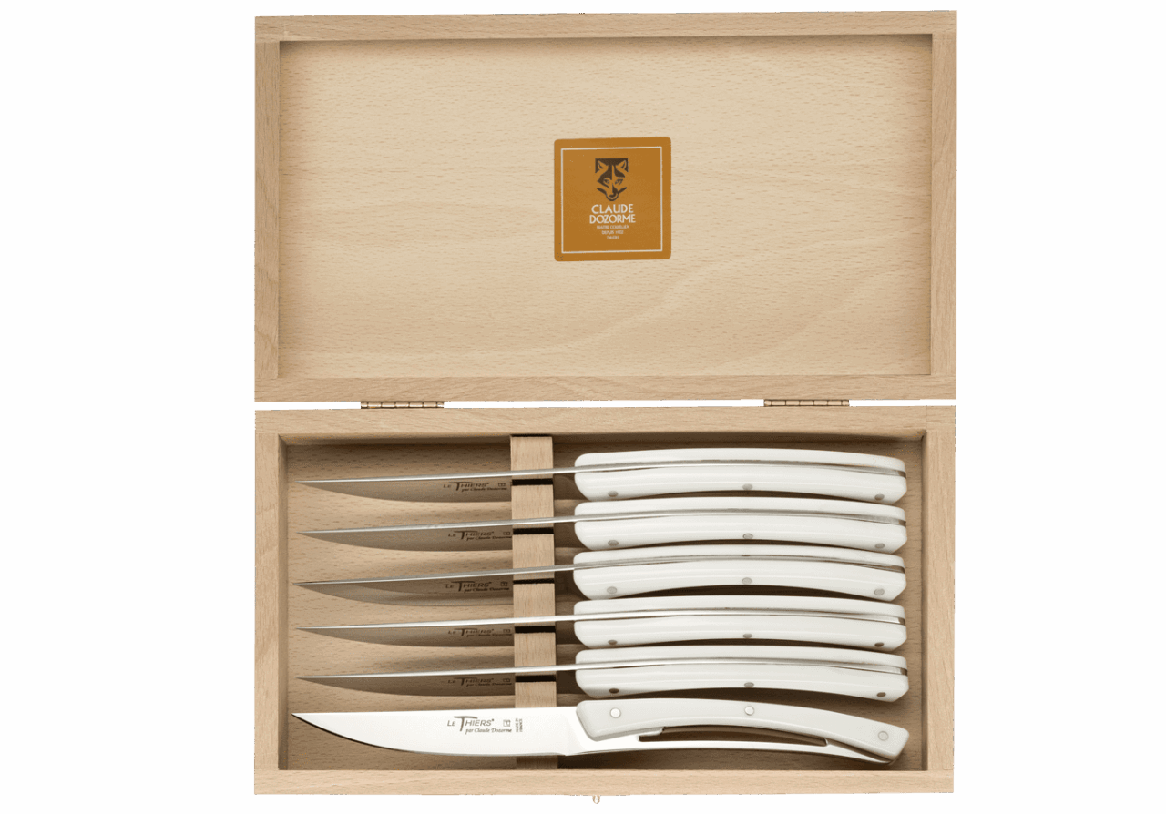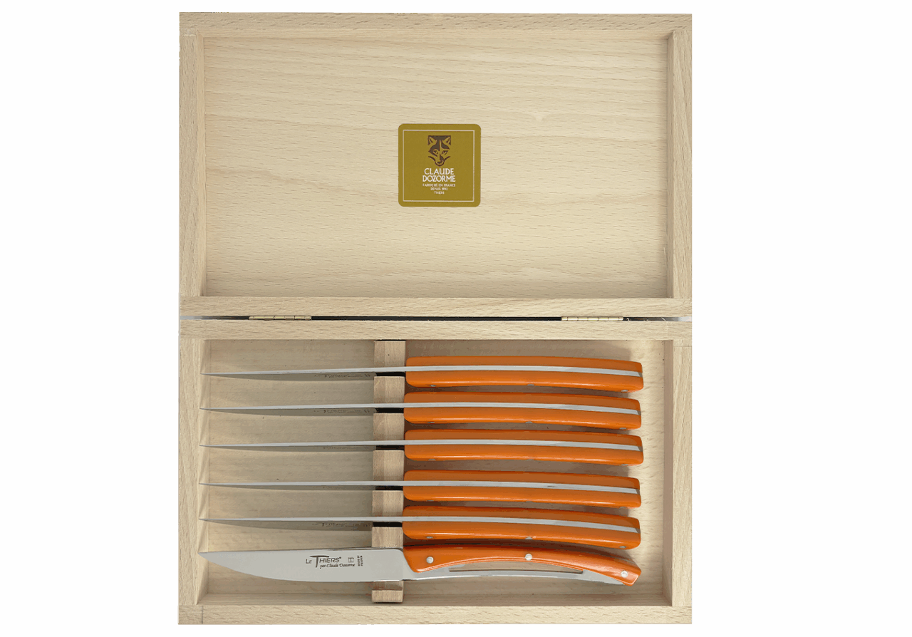 Disponible en bois olivier, Krion blanc, orange ou noir, Le Thiers® Liner de Table est un couteau moderne et élégant.