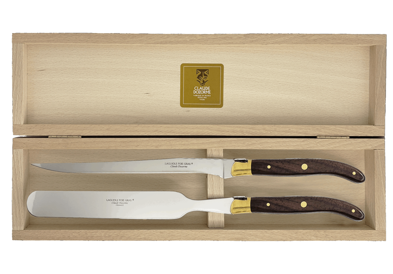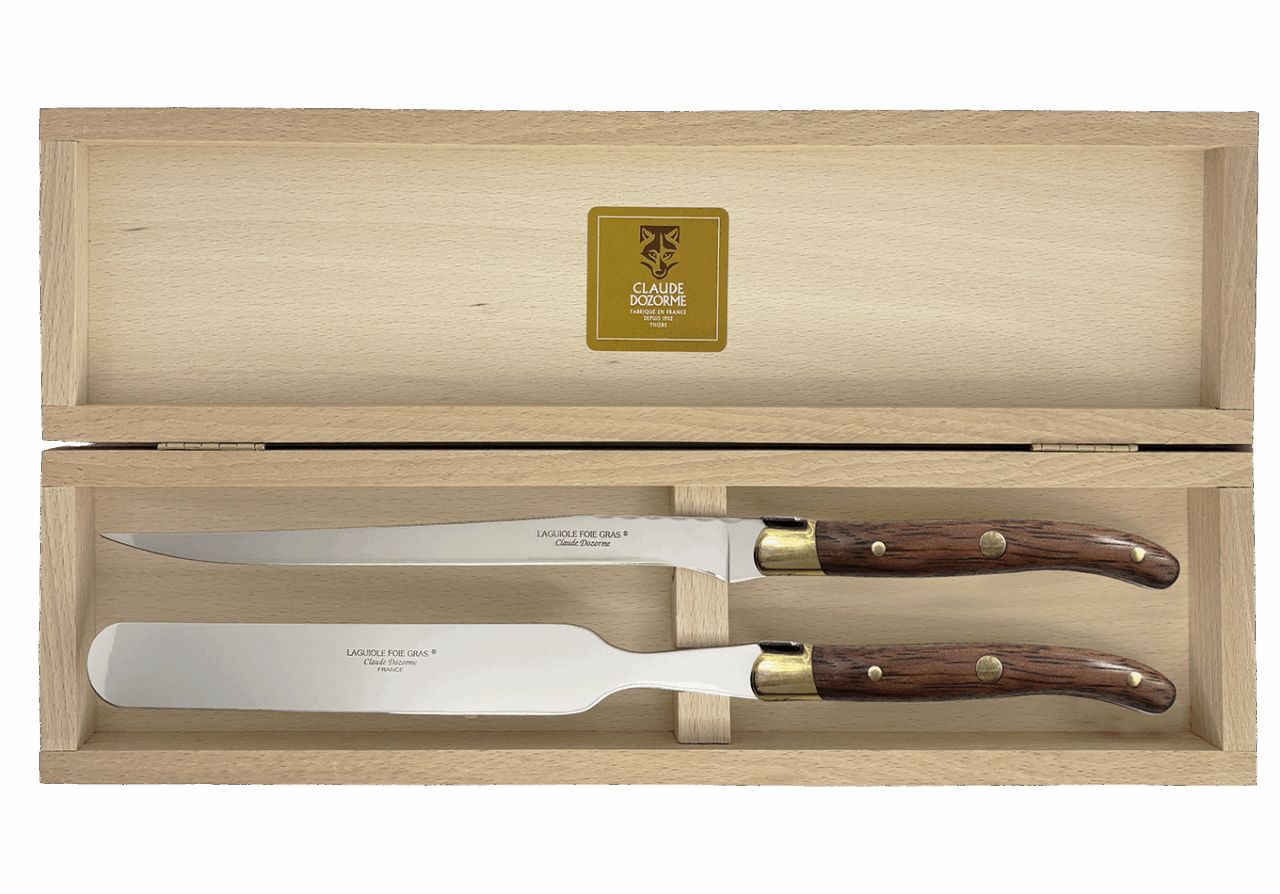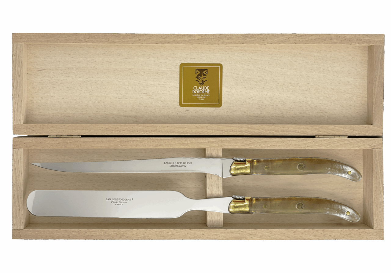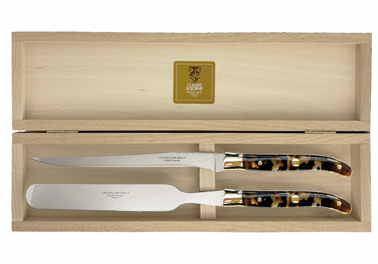 Le service à foie gras est constitué d’un couteau à foie gras et d’une spatule. Le couteau à foie gras possède une longue lame fine et pointue ce qui permet de l’insérer facilement dans le foie gras et de découper de belles tranches. La spatule longue et large permet de servir les tranches avec élégance et sans les effriter. Un coffret indispensable lors de vos repas en famille ou entre amis qui apporte une élégance à votre table.
