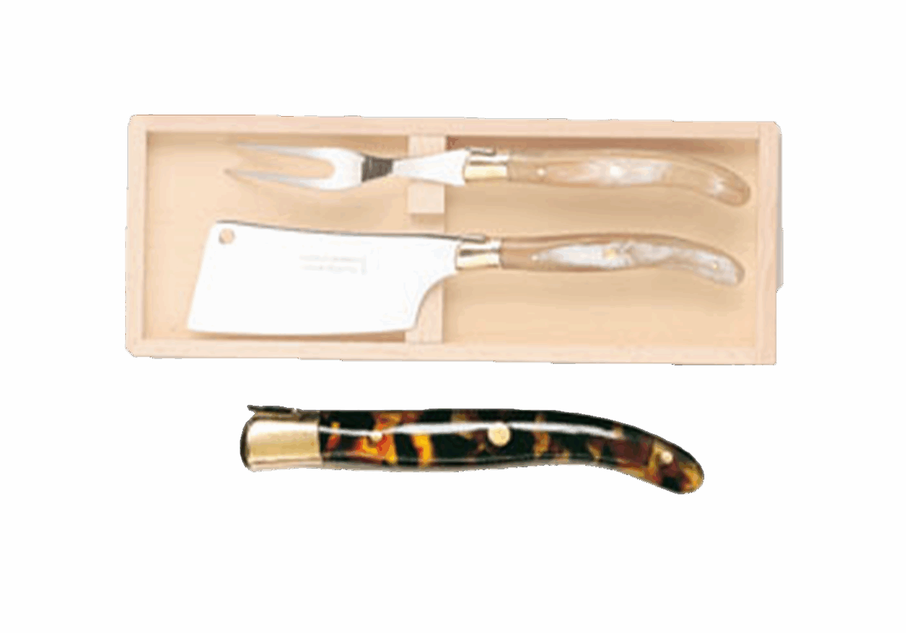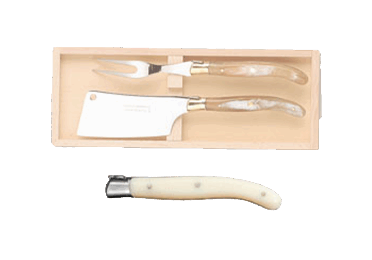Le service à fromage contient deux indispensables : la fourchette à fromage et la hachette à fromage. La hachette permet de faciliter la découpe des fromages à pâte friable comme le chèvre. La fourchette quant à elle, possède deux dents pour piquer les morceaux de fromages.