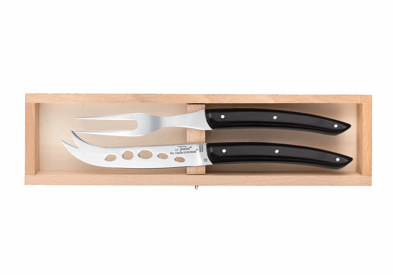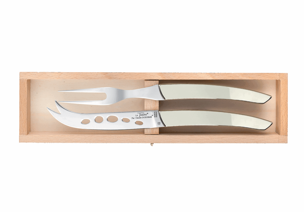 Le set à fromage contient deux indispensables : la fourchette à fromage et le couteau à fromage. Le couteau permet de découper le fromage sans que celui-ci ne colle. La fourchette, quant à elle, possède deux dents pour piquer les morceaux de fromage.